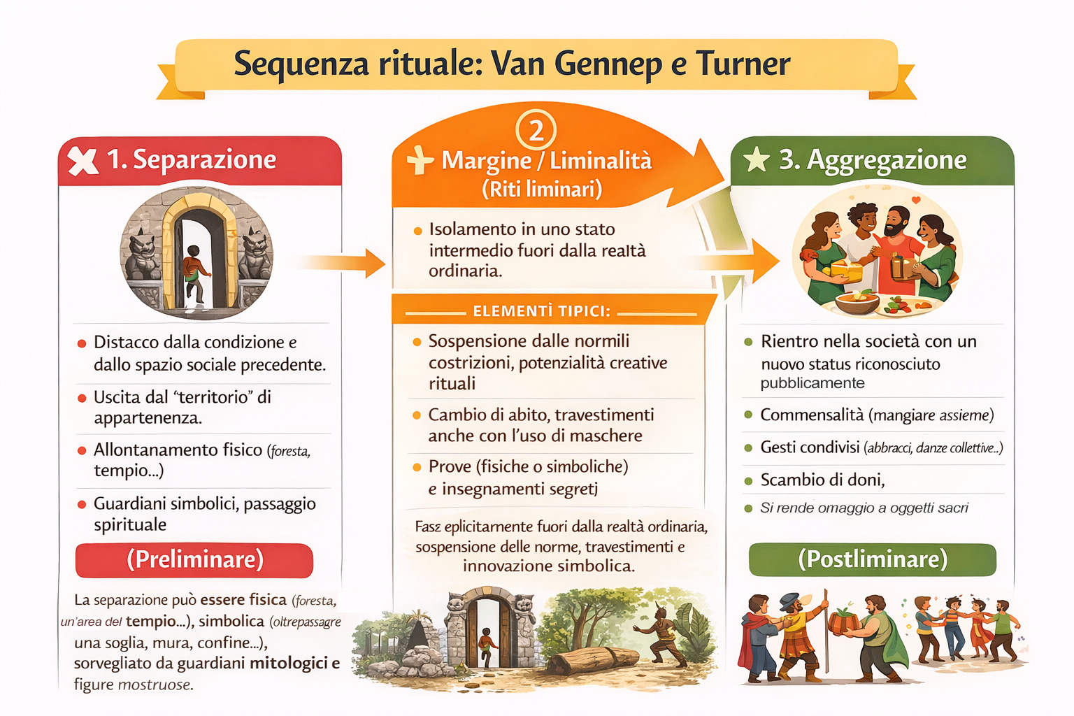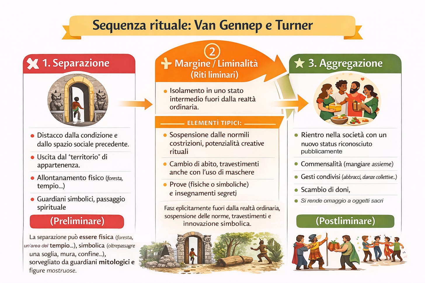 Arnold Van Gennep individua tre fasi che compongono la sequenza rituale, in proporzioni e modalità diverse ma sempre presenti e Turner approfondirà successivamente la fase liminale: