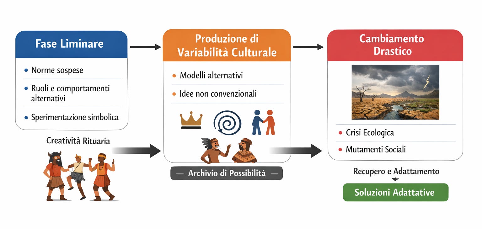 generazione di variabilità e modelli alternativi a quello dominante da parte dell’immaginazione libera dai consueti vincoli; una cultura che conserva tali modelli, all’apparenza poco funzionali o assurdi, potrebbe dimostrarsi più resiliente nel caso di un drastico cambiamento delle condizioni ecologiche e biologiche (resilienza adattativa).